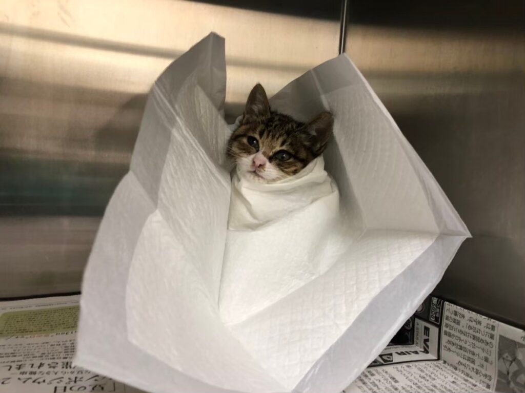 頭が常にユラユラしていて上手くご飯を食べれなかったのでスタイつけるよーとペットシーツをふざけてつけてました笑。ムスッとしてます(かわいい)