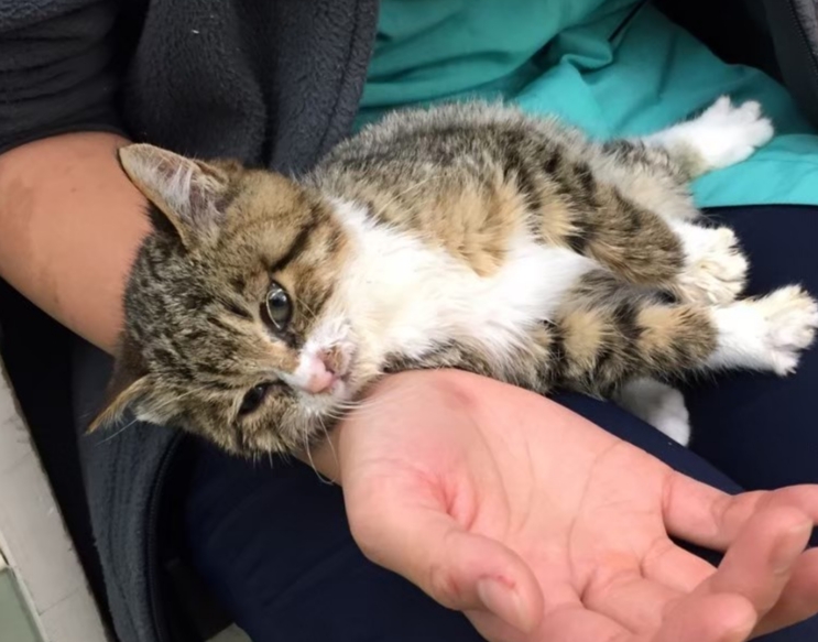 「野良の子が子供産んだけど、この子だけ全く育たない」とボロボロの小さい子猫。いろいろあり当時勤めていた動物病院の居候猫として保護されました〜