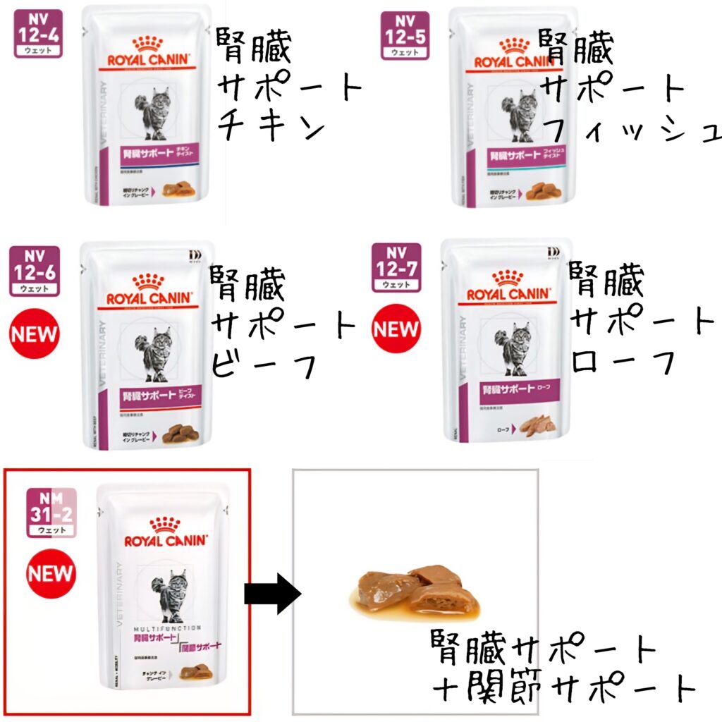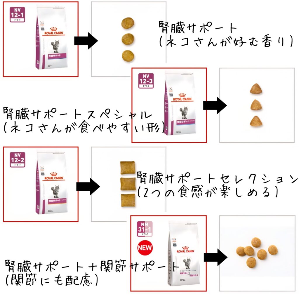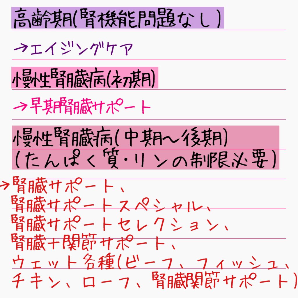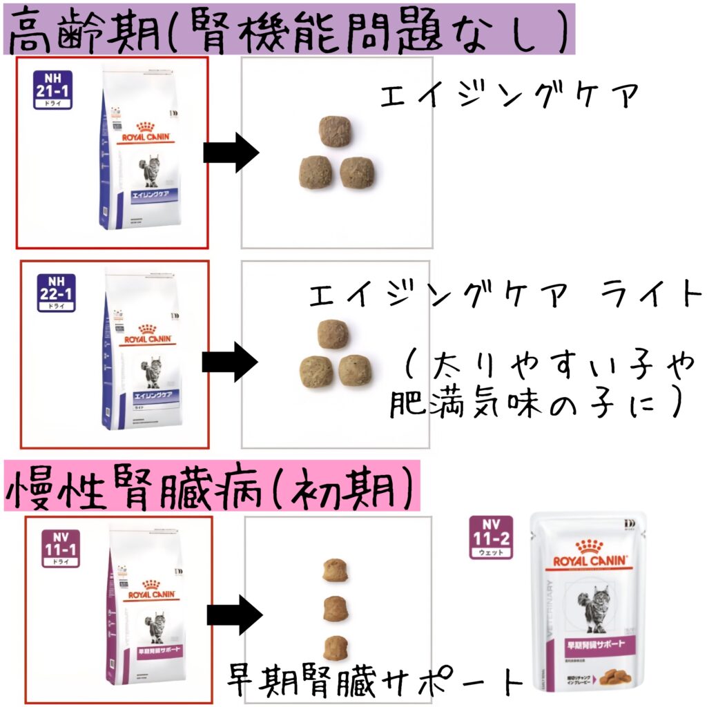最後に、シニア期のネコさんの療法食を腎臓サポートメインにまとめてみました!(ロイヤルカナン参考)